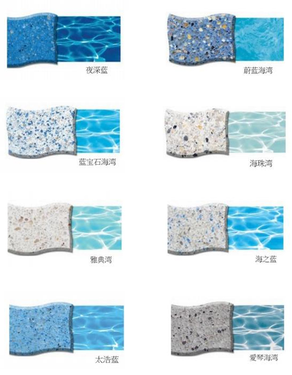 可用于各種色彩及紋理材質。不同的色彩及骨料型號可以良好的滿足(適用于)任何設計要求。為泳池的擁有者提供了可替代傳統(tǒng)白色涂料的、非常耐用且極具吸引力的彩色涂料。