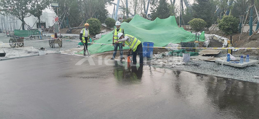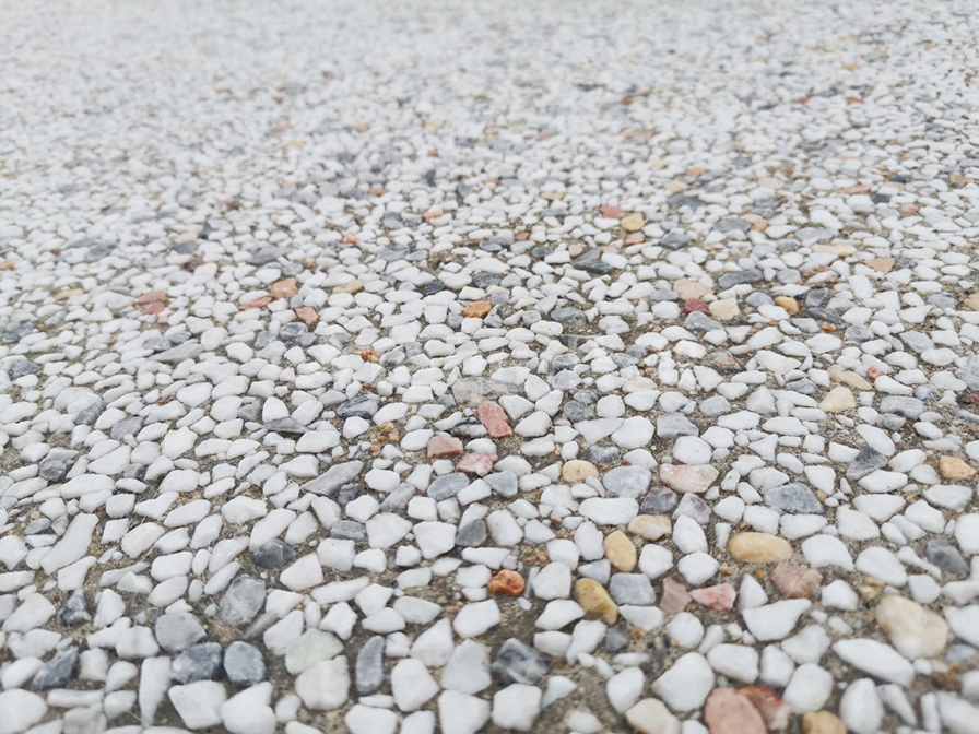 礫石聚合物藝術地面是在通體彩色混凝土初凝前合適的時機按照一定的比例要求將特殊骨料均勻的拋灑于彩混面層,再將骨料拍入面層后進行收光,最后在面層均勻噴灑鈍化劑薄膜覆蓋,待混凝土固化到一定程度對表面進行清洗露出骨料原貌的一種裝飾做法。